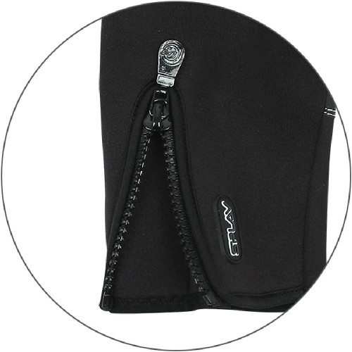 Широко раскрывающийся вход в перчатку утягивается молнией, расположенной на тыльной (неопреновой) стороне ладони. Застегнутая перчатка сидит, как влитая.