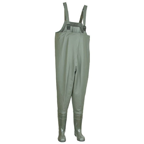 Полукомбинезон изготовлен из водонепроницаемого материала (трикотажного полотна, пропитанного ПВХ) и приварен к сапогам.
