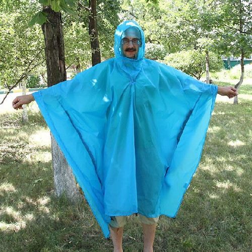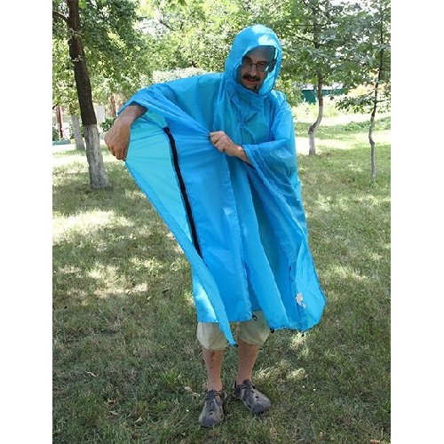 О прочности данной ткани достаточно красноречиво говорит то, что ее используют при производстве парапланов; - К конструктивным особенностям пончо относятся боковые молнии, которые не дают ему расходиться во время движения, освобождают руки и очень повышают вероятность того, что вы и ваш рюкзак останетесь сухими;
