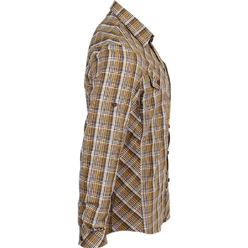 Прочная и износостойкая ткань рубашки легко переносит длинные переходы с рюкзаком, не изнашиваясь и не теряя формы, и быстро высыхает при намокании.