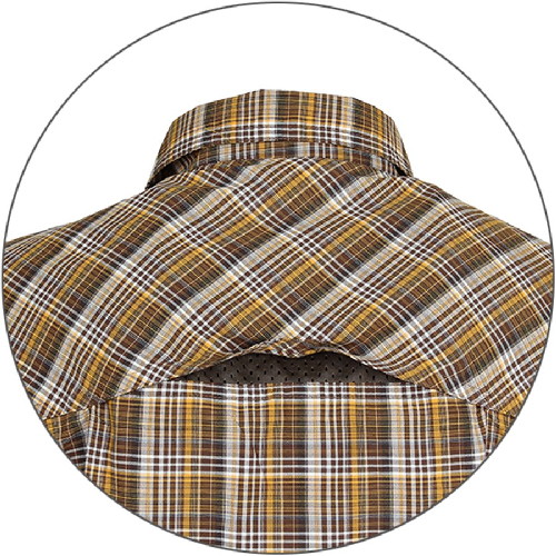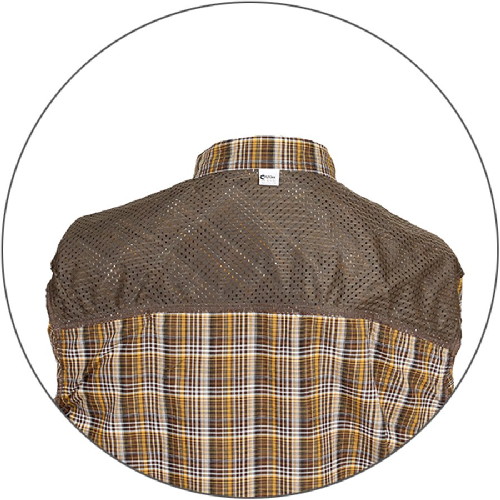 Рубашка, изготовленная из легкого нейлона, холодит в жару и защищает от ультрафиолета, а для большей вентиляции на спине предусмотрена отлетная кокетка с вентиляционной сеткой.