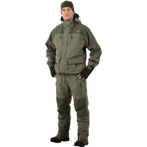 Удобный для рыбалки покрой куртки и брюк, множество карманов 12 шт. Такие места, как локти, колени, низ штанин дополнительно усилены прочным и грязеотталкивающем материалом. На брюках с завышенной талией, имеются отстегивающиеся подтяжки, низ штанин регулируемый. Куртка имеет отстегивающийся капюшон и москитную сетку. Сзади куртки, на воротнике имеется крепление для подсака.