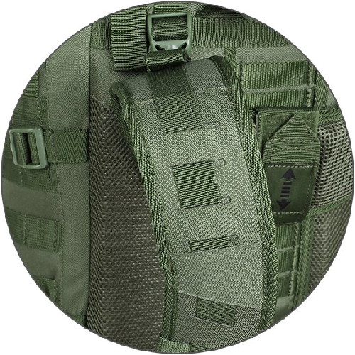 - Съемные, регулируемые по высоте лямки. Большая ширина, анатомический силуэт. Два слоя пены и сетка Airmesh для мягкости и вентиляции. Верхние оттяжки. Ячейки PALS для крепления подсумков выполнены методом лазерной резки в усиленной ткани, что обеспечивает лямкам тонкий профиль и плоскую поверхность, не мешая прикладке оружия