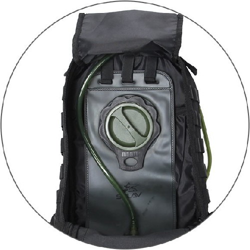 - Передняя поверхность внешнего кармана обшита стропами PALS/MOLLE, 5 ячеек в ширину, 4 ряда в высоту. Выше имеется плоский карман со входом на молнии, для удобства ориентированной под углом