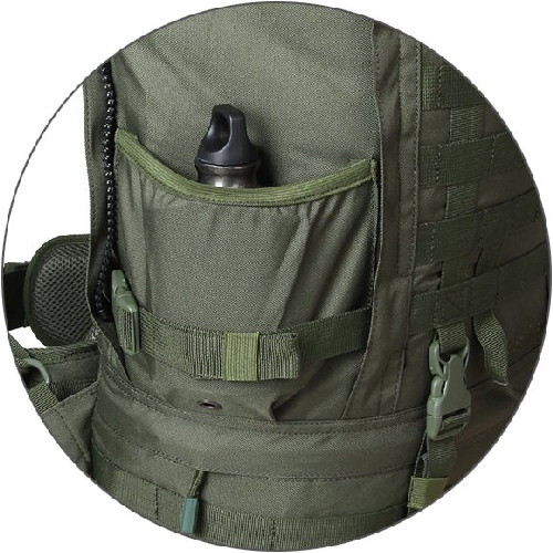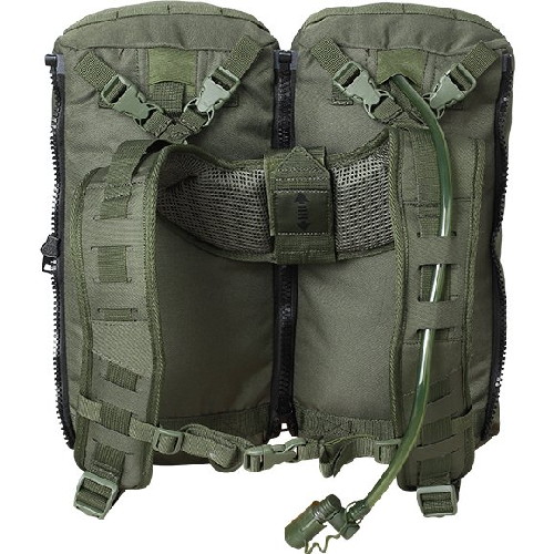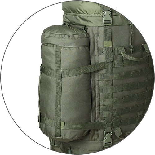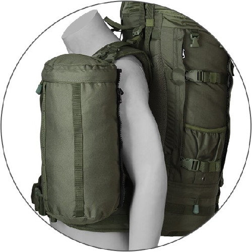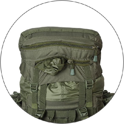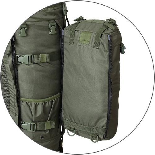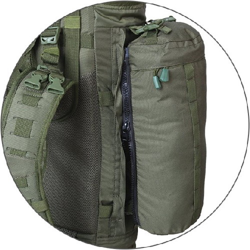 - На боках рюкзака нашиты вертикальные 20 мм фастексы и крупные тракторные молнии для быстрой установки/демонтажа съемных карманов