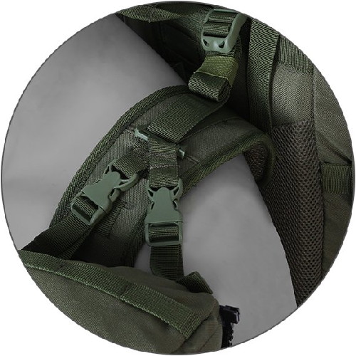 Съемные, регулируемые по высоте лямки. Большая ширина, анатомический силуэт. Два слоя пены и сетка Airmesh для мягкости и вентиляции. Верхние оттяжки. Ячейки PALS для крепления подсумков выполнены методом лазерной резки в усиленной ткани, что обеспечивает лямкам тонкий профиль и плоскую поверхность, не мешая прикладке оружия