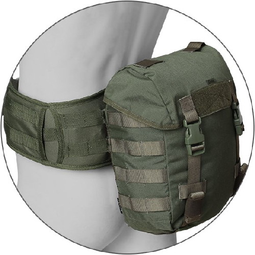 Съемный широкий пояс - аналог пояса РПС/рюкзачного. Боковые оттяжки, ячейки PALS по всей длине (включая посницу), 4 полукольца для подвески лямок РПС (совместимость с лямками плечевыми облегченными v.3)