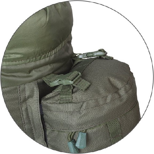 - Боковые стяжки на фастексах, которые можно натягивать как поверх съемных карманов, так и под ними, для чего под тракторными молниями крепления карманов имеются специальные прорези, в которые продеваются фастексы стяжек