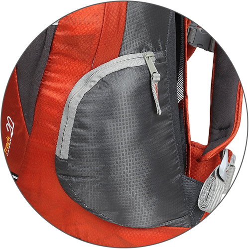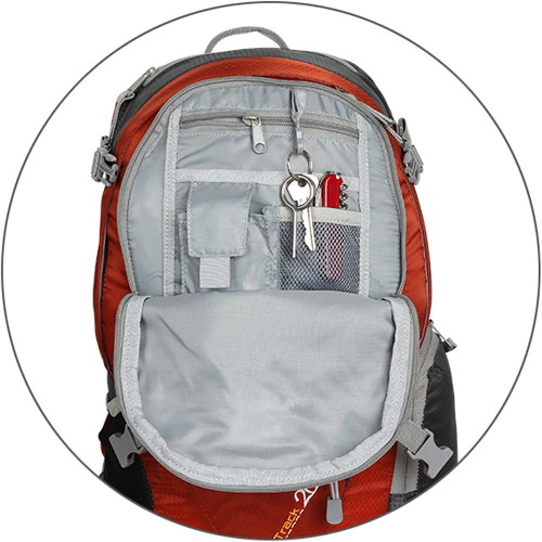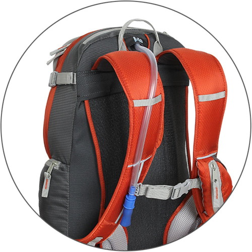 Вход в основное отделение застегивается на застежку-молнию. Спинка с интегрированным упругим стальным каркасом обеспечивает отличную вентиляцию и дает необходимую жесткость конструкции. Перед рюкзака дополнен открытым карманом, который фиксируется фастами. Фронтальный карман дополнен внутренним органайзером для мелочей. Точка крепления треккинговых палок или ледоруба. Маленький карман в верхней части рюкзака отделан мягким трикотажем. Широкая лямка рюкзака дополнена небольшим накладным кармашком. Возможна установка питьевой системы (в комплект не входит).