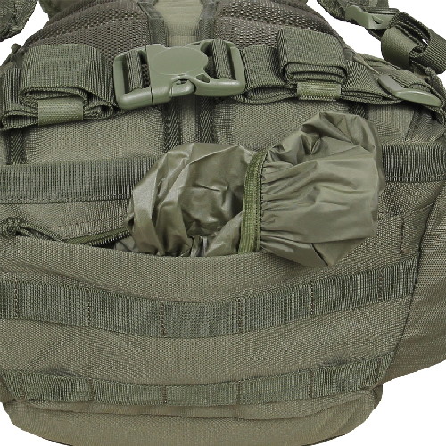 - Внешний нижний карман большой площади, вход на вертикальной молнии сбоку. Внешняя поверхность обшита стропами PALS/MOLLE, 6 ячеек в ширину, 6 рядов строп в высоту