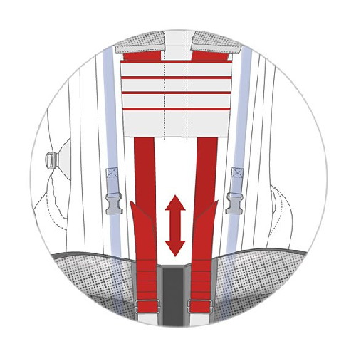 - Уникальная регулируемая подвесная система. Каждая лямка вставляется в свой канал из строп на нужной высоте и фиксируется своей металлической пряжкой внизу к съемному поясу. Благодаря такой системе лямки фиксируются абсолютно без люфта и практически соответствуют полностью пришитым лямкам. Так же благодаря уникальности конструкции при увеличении ростовки, увеличивается расстояние между «вылетом» лямок