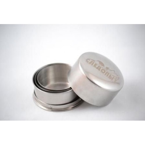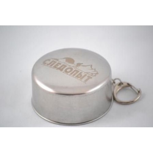 - Складной стакан «Следопыт» объемом 75 мл – небольшой походный стакан, изготовленный из нержавеющей стали и оснащенный удобным карабином на крышке.