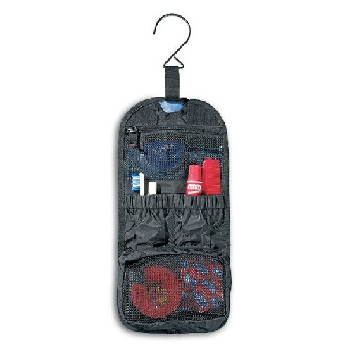 Два сетчатых отделения на молнии, два кармашка, ремешок и крючок для подвешивания.