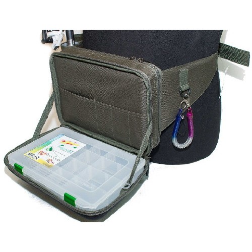 В 4 плоских кармана можно поместить инструмент и пакеты с поводками. Имеет удобный крепёж для спиннинга, позволяющий быстро освободить руки. В комплект входят две самоклеющиеся липучки для соединения коробки с откидной крышкой.