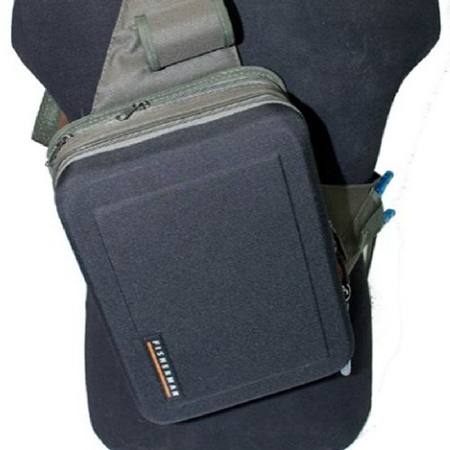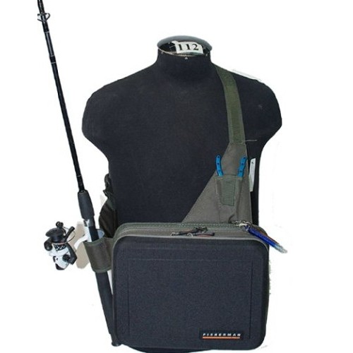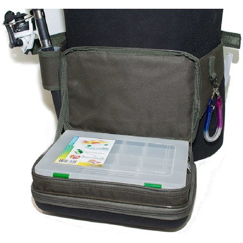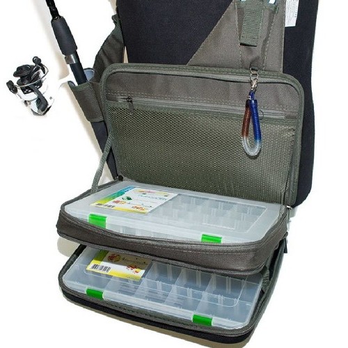 В 4 плоских кармана можно поместить инструмент и пакеты с поводками. Имеет удобный крепёж для спиннинга, позволяющий быстро освободить руки.