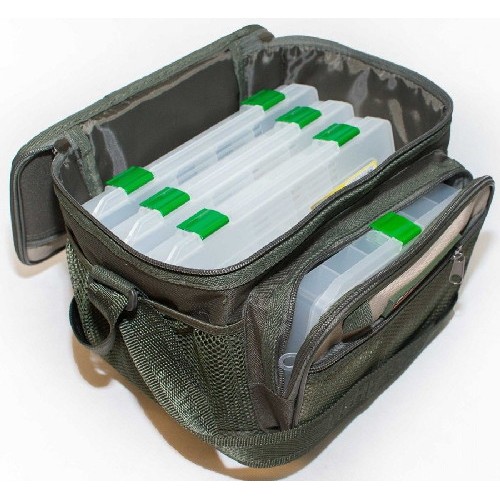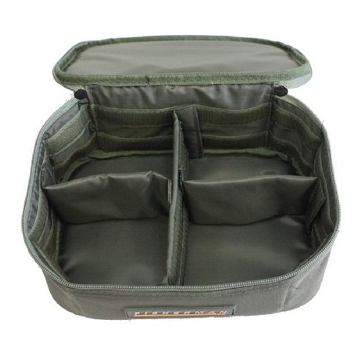В комплекте с сумкой идет чехол для хранения спиннинговых катушек на 4 отсека. Стенки уплотнённые пенополиэтиленом позволяют сохранить катушки в сохранности. Чехол имеет 3 регулируемые перегородки позволяющие настроить гнезда под удобный размер, и ручку для переноски. Он подойдет также для хранения грузил, бойлов кормушек и пр. Чехол крепится к крышке сумки с помощью 2-х липучек, при этом рукоятка для переноски регулируется под нужную длину.