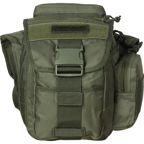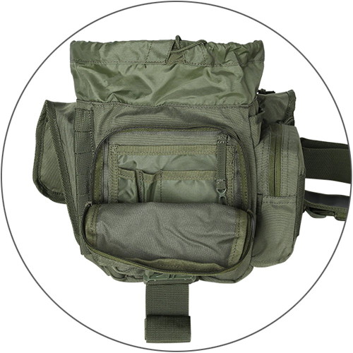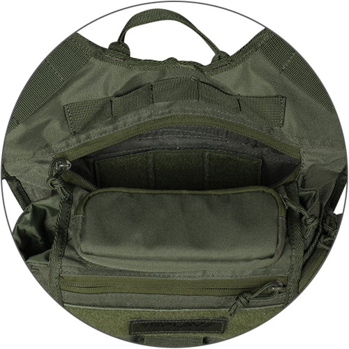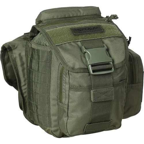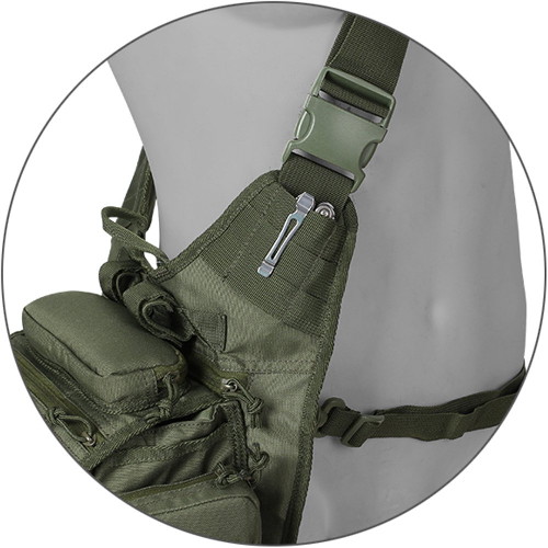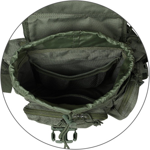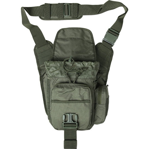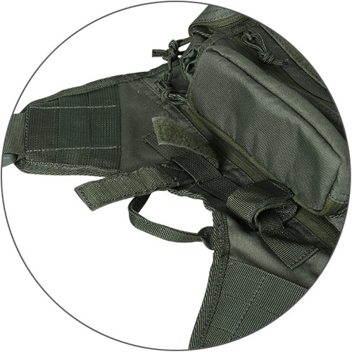 Боковой карман с усиливающей вставкой и стропами MOLLE. Удобный широкий регулируемый плечевой ремень со съемной мягкой накладкой.