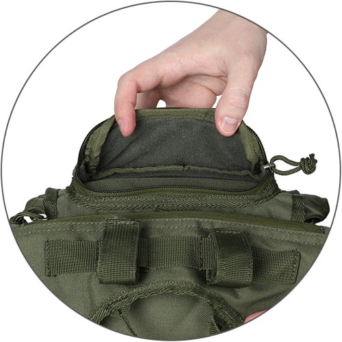 Большой отдельный отсек c возможностью крепления кобуры для скрытого ношения оружия. Фронтальный карман с двумя малыми кармашками и карабином для ключей.
