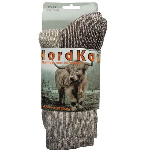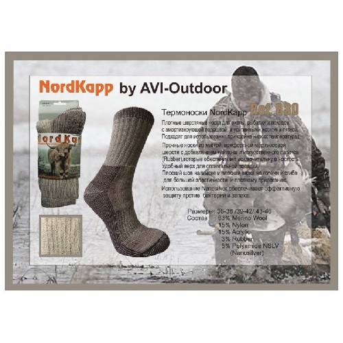 Термоноски NordKapp Alaska 930 от компании AVI-outdoor являются прочными носками из мягкой шерсти мериноса, с добавлением нейлона и латекса, обеспечивающего комфортную носкость. Латекс использован в термоносках NordKapp в зонах пятки и мыска: усиление для прочности. Латекс аналогичен добавлению кордуры(Cordura) в трикотажных изделиях. Оба материала придают прочность ткани, в которую они добавлены.