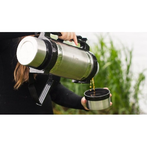 Объёмная внутренняя колба позволяет вместить больше количество еды или напитка, достаточное, чтобы накормить нескольких человек. Под одной из крышек скрывается дополнительная чашка и пробка с кнопкой, под другой — две стальные складные ложки.