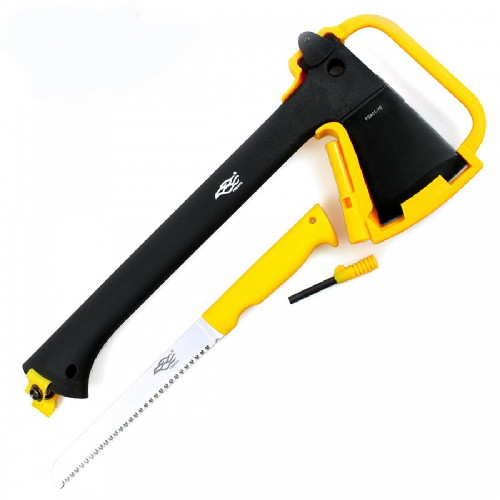 Модель Firebird FSA01-YE ориентирована на тех туристов, которые хотели бы иметь полноценный набор инструментов для заготовки дров на природе, а также возможность в любых условиях разжечь костер. В комплекте имеется не только топор, но и пила, также огниво. Однако все инструменты настолько удачно скомпонованы, что они занимают самое минимальное количество места. Пила хранится внутри ручки топора, а огниво размещено в специальном отсеке чехла для этого же инструмента.
