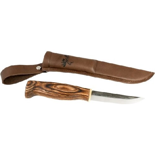 Классический финский охотничий нож из углеродистой нержавеющей стали и рукоятью из древесины карельской березы.