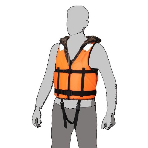 Спасательный жилет застегивается на застежку-молнию с перекидным двухсторонним замком, но дополнительно оснащен двумя грудными ремнями-стяжками, которые легко переставляются на нужную сторону. В обязательном порядке содержит вставки из световозвращаюшей ленты в местах, которые будут видны, когда человек окажется в воде. Паховый ремень надежно фиксирует жилет на теле, не позволяя тому сползти с человека. Снабжен специальным громким свистком из прочного пластика на шнуре, закрепленном на груди жилета. Имеется объемный карман с отверстием для слива воды.