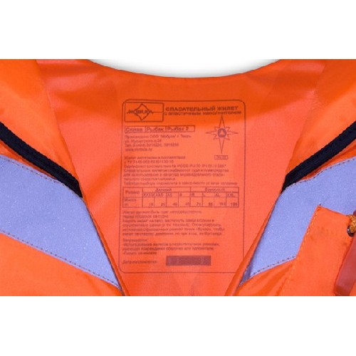 Спасательный жилет застегивается на застежку-молнию, но дополнительно оснащен двумя грудными ремнями-стяжками. В обязательном порядке содержит вставки из световозвращаюшей ленты в местах, которые будут видны, когда человек окажется в воде. Паховый ремень надежно фиксирует жилет на теле, не позволяя тому сползти с человека. Снабжен специальным громким свистком из прочного пластика на шнуре, закрепленном на груди жилета. Имеется объемный карман (на всех размерах, кроме S) с отверстием для слива воды. Модель имеет застежку на молнии и подголовник.