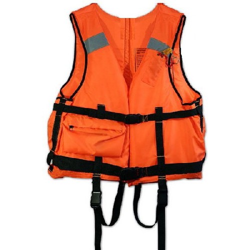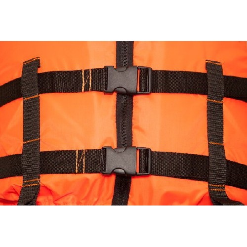 Спасательный жилет застегивается на застежку-молнию, но дополнительно оснащен двумя грудными ремнями-стяжками. В обязательном порядке содержит вставки из световозвращаюшей ленты в местах, которые будут видны, когда человек окажется в воде. Паховый ремень надежно фиксирует жилет на теле, не позволяя тому сползти с человека. Снабжен специальным громким свистком из прочного пластика на шнуре, закрепленном на груди жилета. Имеется объемный карман с отверстием для слива воды.