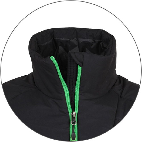 Полочка и спинка выполнены в виде сэндвича из верхней стрейч ткани, с защитой от дождя и ветра, 1 слоя Primaloft® Silver 100 и подкладочной ткани